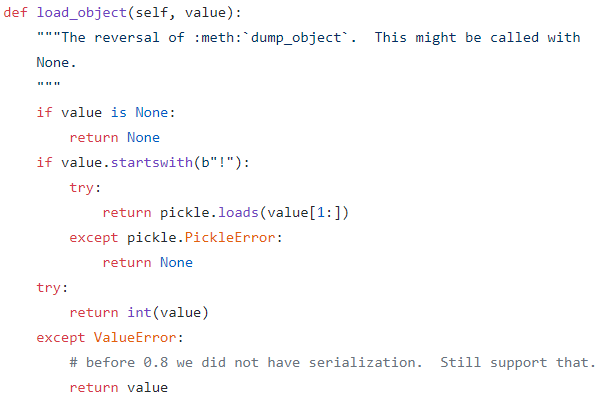 Looking at the source, I saw that if the object content starts with a "!", flask-caching will unpickle the content when loading it. Python's pickling library is a famous vector for insecure deserialization, so if we can get it to unpickle our custom payload, we can easily get RCE.