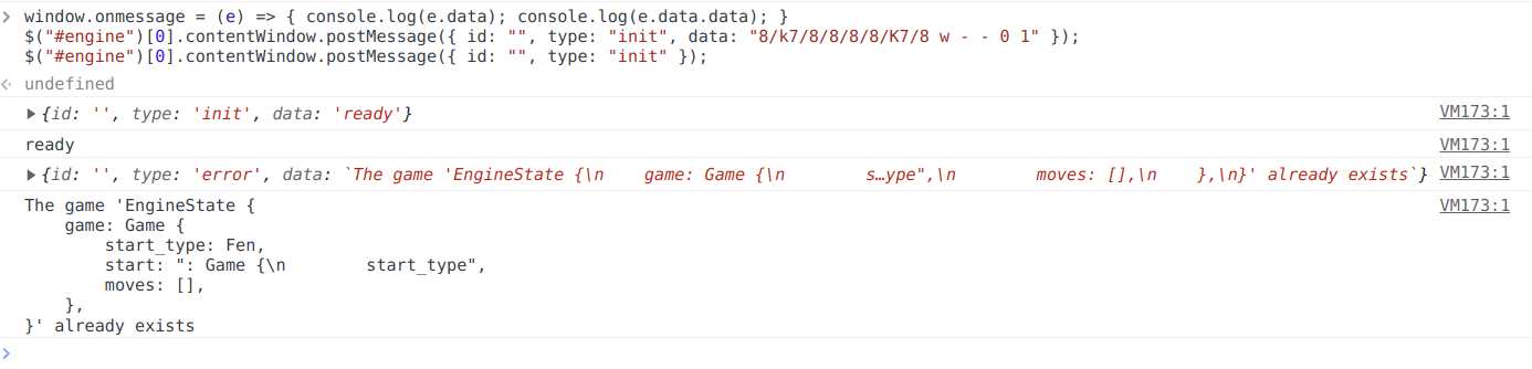So, by placing https://chessrs.mc.ax in an iframe, we can know when the WASM is loaded (when we recieve a ready messaage), as well as have the admin's game created at any time (by sending a ready message to the iframe). Perfect!