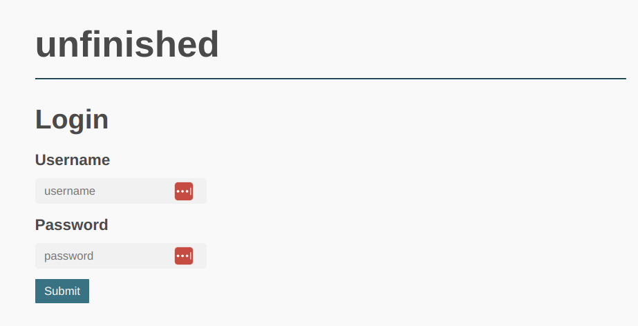 unfinished was a challenge with per-team instances, which should hint to you that your solution will probably break the site. Going to the URL provided, you see a login page, with what looks like no way to bypass it. Luckily, source was provided. In the source, we see there are two containers, one for the NodeJS web application, and one for the MongoDB instance that holds the users and also the flag.
