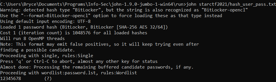 I then ran John the Ripper (jumbo edition) on the Bitlocker hashes, and it quickly came up with the password.