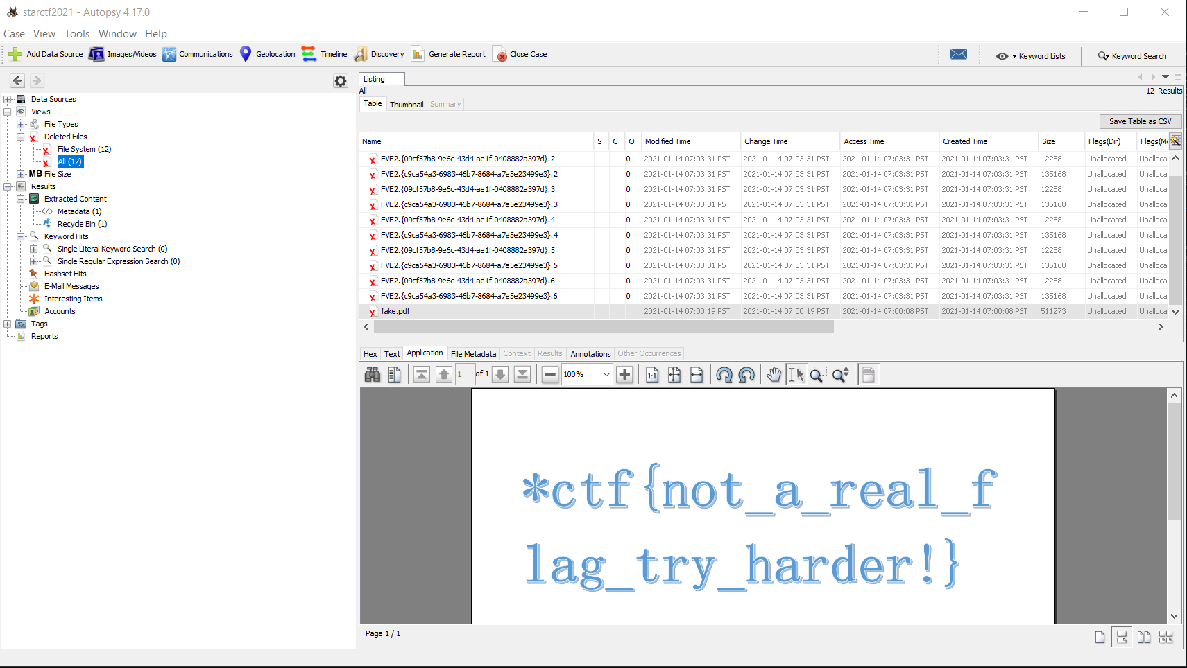 A password.txt file which just held the text "12345678". Damn. Well, that couldn't have been the only thing in the disk image since it was 132MB. So, I loaded up Autopsy, a really amazing forensics tool that is a GUI version of the sleuth kit. I quickly found a PDF in the deleted files: